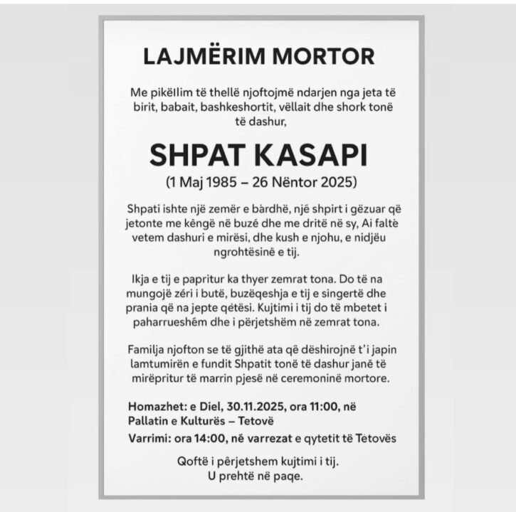 Familjarët, miqtë dhe të gjithë dashamirësit e muzikës së tij ndër vite janë njoftuar nga familja e të ndjerit Shpat Kasapi, e cila ka bërë publik lajmërimin mortor për ceremoninë e varrimit.