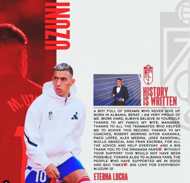Një djalë plot ëndrra që nuk u dorëzua kurrë. Lindur në Shqipëri, Berat. Jam shumë krenare për veten time. Punë e vështirë. Unë gjithmonë besoj në veten time. Faleminderit familjes time, gruas sime dhe menaxherit tim. Faleminderit të gjithë lojtarëve që më ndihmuan të arrij këtë rekord. Faleminderit trajnerëve të mi. Robert Moreno, Aitor Karanka, Paco López, Alex Medina, José Sandoval, Guille Abascal dhe Fran Escriba për të gjitha këshillat dhe ndihmën çdo ditë. Dhe një falenderim i madh për tifozët e Granadas️. Pa mbështetjen tuaj kjo nuk do të ishte e mundur, falenderoj fansat shqiptarë, njerëzit, miqtë e mi, që më kanë mbështetur në momentet e mira dhe të këqija. Shumë dashuri për të gjithë. M.Uzuni 10.