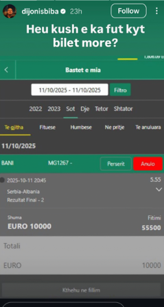 Pas triumfit historik të Shqipërisë me rezultatin 0-1 në Beograd, basti i tij rezultoi fitues. Me shumën e vendosur dhe koeficientin e lartë të ndeshjes, ish-fituesi i “Ferma VIP” përfitoi plot 55,500 euro. Kështu, Biba përjetoi dyfish emocionet e mbrëmjes: si tifoz i zjarrtë i kombëtares dhe si fitues i një shume të konsiderueshme parash.