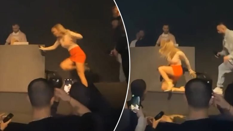 Kjo ndodhi në një ndër lokalitet e njohura të natës, ku ajo ka hasur në një pengesë që e ka detyruar të bjerë në tokë teksa po ngjitej në skenë.