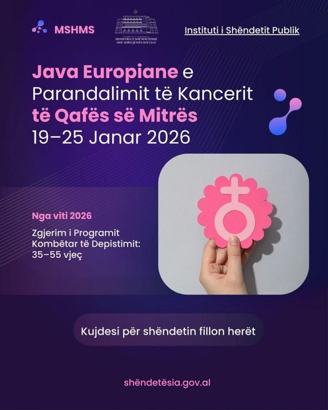Ministria e Shëndetësisë dhe Mirëqenies Sociale, përmes Institutit të Shëndetit Publik i bashkohet edhe këtë vit Javës Europiane për Parandalimin e Kancerit të Qafës së Mitrës, për të rikujtuar se parandalimi shpëton jetë.